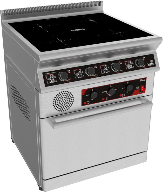 Плита индукционная с духовым шкафом, 4 конфорки мощностью 4х3,5кВт, духовой шкаф - 2 тена (верх/низ) по 2,4кВт, 5 уровней под противни 530х470мм, электронная панель управления плитой с цифровой индикацией, управление духовым шкафом отдельное независимое, 13 уровней нагрева индукции , таймер до 180мин., регулировка температуры духового шкафа механическая (50-270°С), корпус плиты из н.с. AISI 304, духовой шкаф-черный металл, регулируемые по высоте ножки, рабочая поверхность плиты - стеклокерамика 6мм. Протвиня в комплект не входят. 19 кВт, 380В, вес 98 кг.
