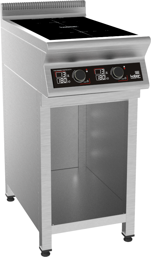 Плита индукционная на полузакрытой подставке, 2 конфорки мощностью 2х3,5кВт, электронная панель управления с цифровой индикацией, 13 уровней нагрева, таймер до 180мин., съемный жировой фильтр, корпус из н.с. AISI 304, регулируемые по высоте ножки, рабочая поверхность - стеклокерамика 6мм, 7 кВт, 220В, вес 43 кг.